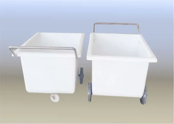 Fabricadas em Fibra de Vidro reforçada com resina poliéster, possuem duplo acabamento liso sanitário GelCoat alimentício na cor branca e pés de Aço Inox AISI 304 de série.
