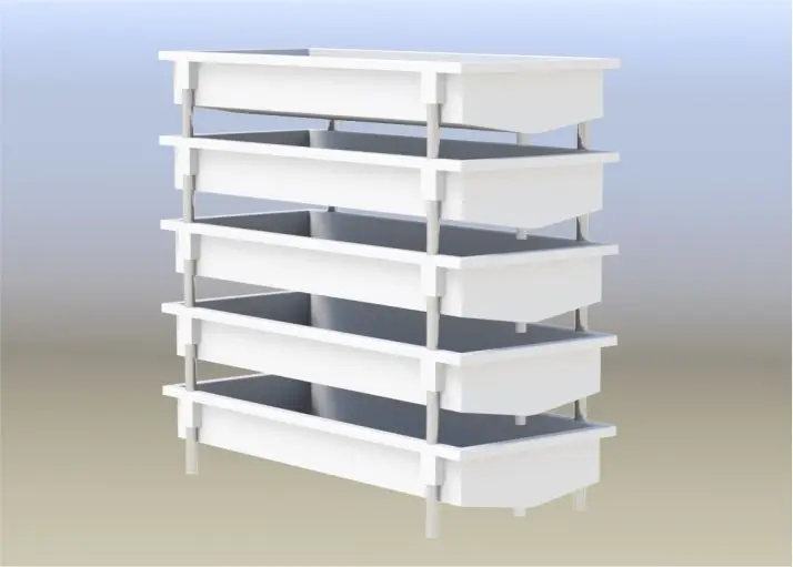 Fabricadas em Fibra de Vidro reforçada com resina poliéster, possuem duplo acabamento liso sanitário GelCoat alimentício na cor branca e pés de Aço Inox AISI 304 de série.